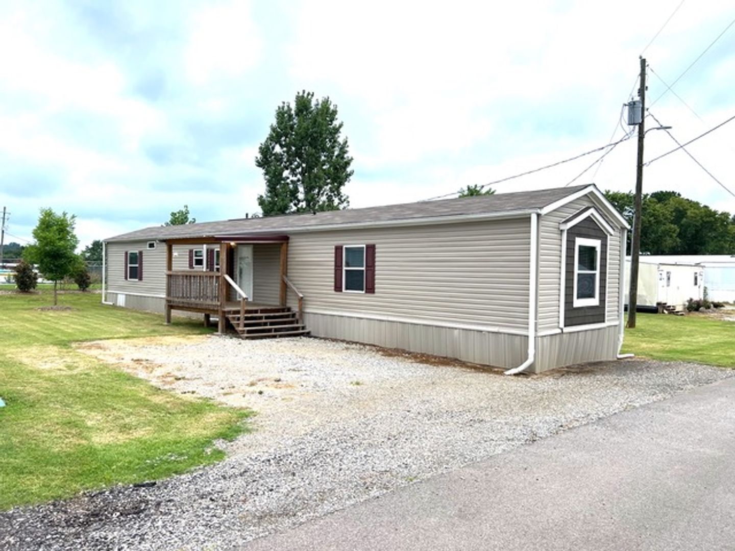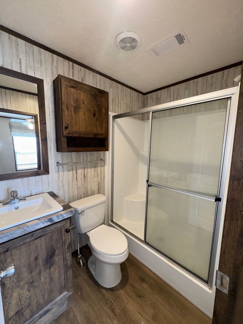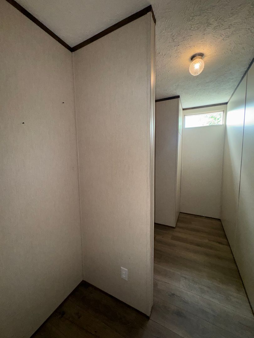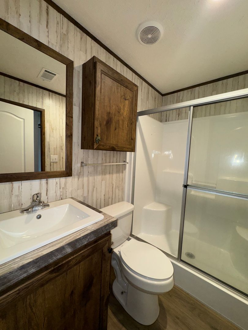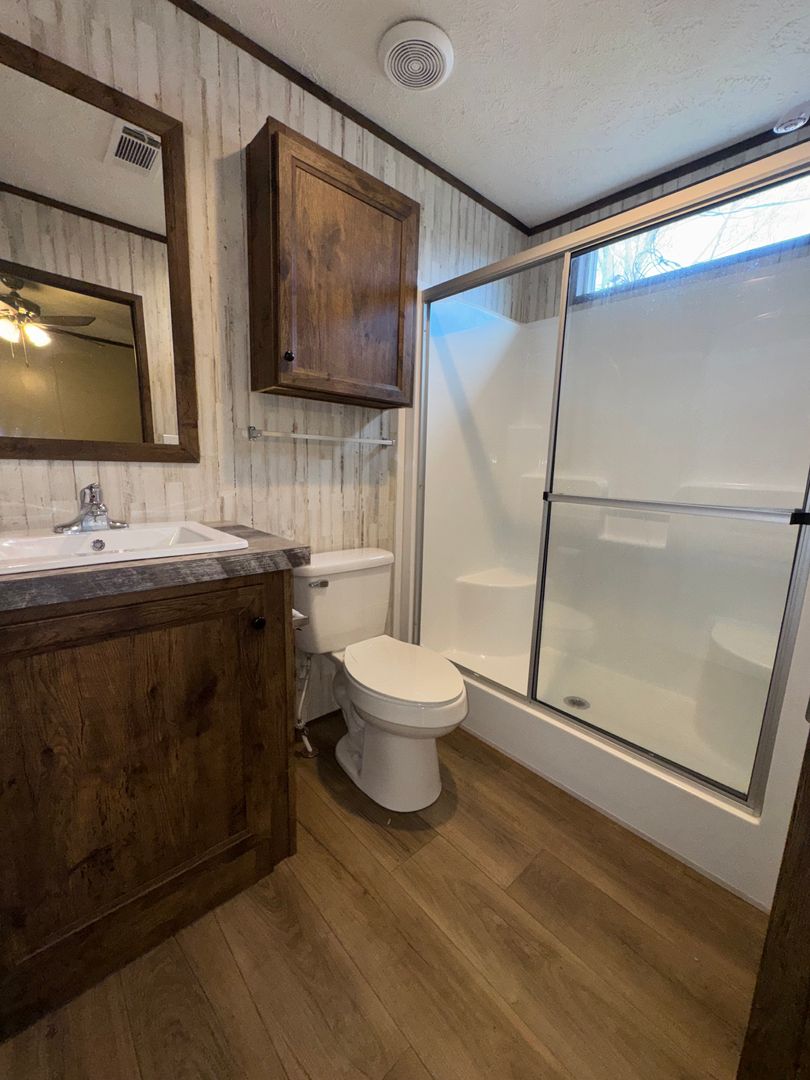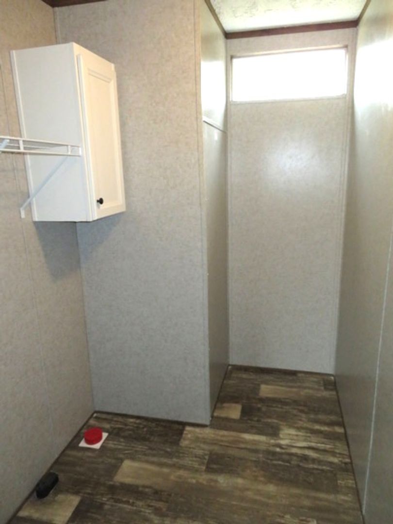 This like-new 2020 Clayton Hunter home has over 1200 square feet and has 3 bedrooms, 3 full baths, and 3 walk-in closets. Yes, each BR has a private bath and its own walk-in closet. All 3 bedrooms are the same size. The home also has roomy 8 ft ceilings with recessed LED lighting and ceiling fans in the LR and all bedrooms. The entire home is wrapped in sturdy OSB siding under the vinyl siding. It also has extra insulation in the walls and ceiling, and low-E double-pane windows for LOW power bills. The heating and air vents are located in the ceiling, so your furniture or rug won't cover your vents. The home is totally electric and has central heat and air, and a digital thermostat you can control from your smartphone from wherever you are. Other features: upgraded 50-gallon water heater so you don’t run out of hot water, steel front door and cottage-type steel rear door, separate laundry room with a pantry wired for a stand-up freezer, open concept kitchen/living area with new black Frigidaire stove with glass tile backsplash, black fridge with ice maker and dishwasher. The kitchen sink has a goose-neck sprayer. Fully lined cabinetry throughout and transom windows, which add extra light. Each bathroom features a sit-down 60" one-piece fiberglass shower with glass doors, china sinks, and towel and tissue holders built in. Built-in entertainment center for your big screen TV, linoleum flooring throughout for durability and easy clean-ups. Large covered deck for entertaining with full-width steps for easy entry and exit.