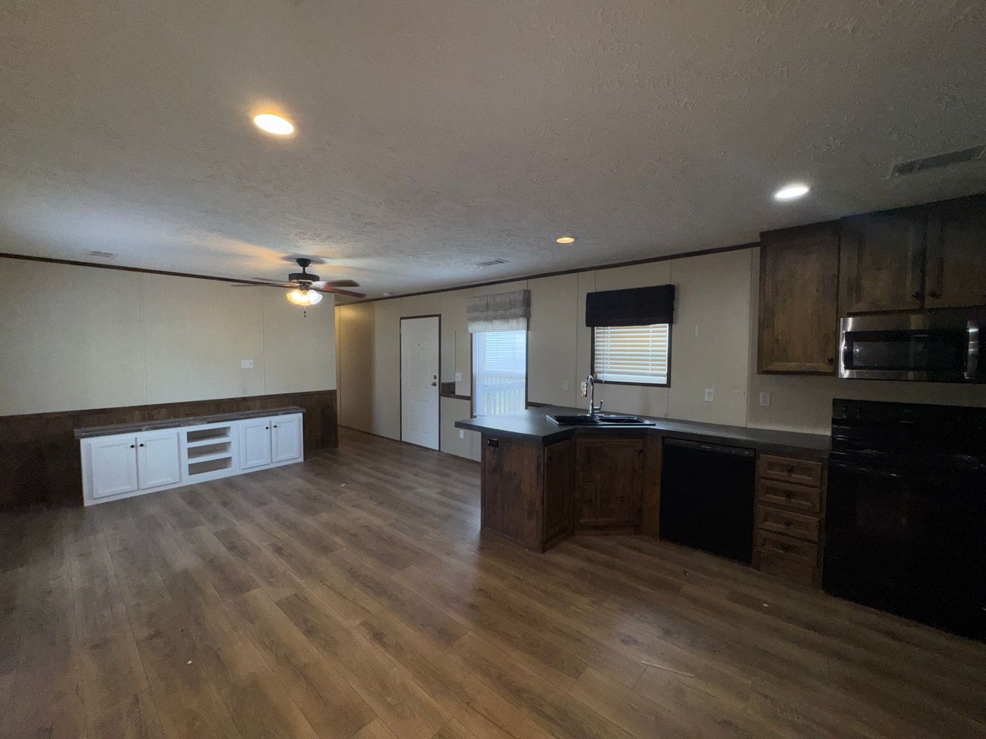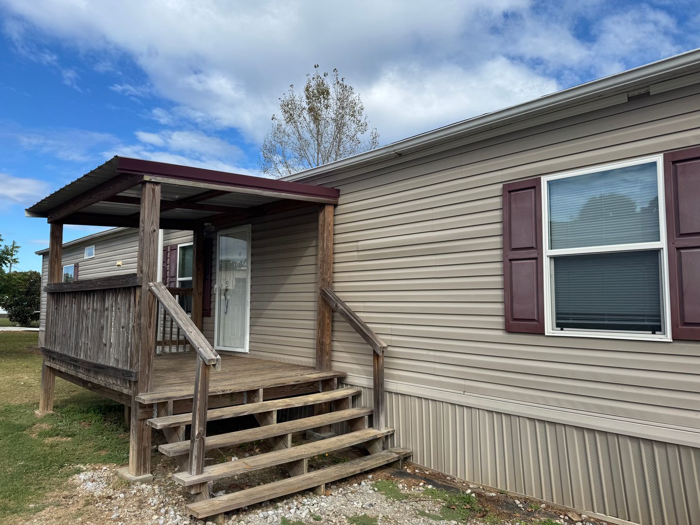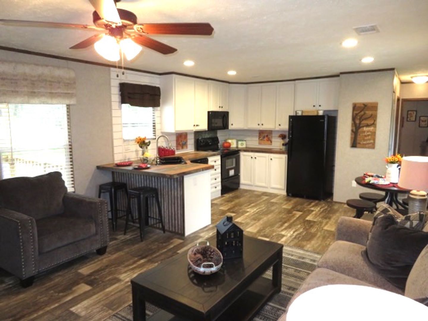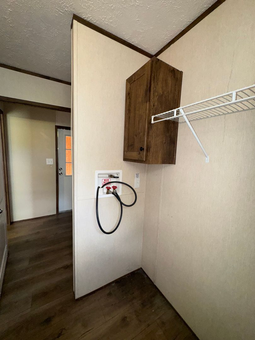 This like-new 2020 Clayton Hunter home has over 1200 square feet and has 3 bedrooms, 3 full baths, and 3 walk-in closets. Yes, each BR has a private bath and its own walk-in closet. All 3 bedrooms are the same size. The home also has roomy 8 ft ceilings with recessed LED lighting and ceiling fans in the LR and all bedrooms. The entire home is wrapped in sturdy OSB siding under the vinyl siding. It also has extra insulation in the walls and ceiling, and low-E double-pane windows for LOW power bills. The heating and air vents are located in the ceiling, so your furniture or rug won't cover your vents. The home is totally electric and has central heat and air, and a digital thermostat you can control from your smartphone from wherever you are. Other features: upgraded 50-gallon water heater so you don’t run out of hot water, steel front door and cottage-type steel rear door, separate laundry room with a pantry wired for a stand-up freezer, open concept kitchen/living area with new black Frigidaire stove with glass tile backsplash, black fridge with ice maker and dishwasher. The kitchen sink has a goose-neck sprayer. Fully lined cabinetry throughout and transom windows, which add extra light. Each bathroom features a sit-down 60" one-piece fiberglass shower with glass doors, china sinks, and towel and tissue holders built in. Built-in entertainment center for your big screen TV, linoleum flooring throughout for durability and easy clean-ups. Large covered deck for entertaining with full-width steps for easy entry and exit.