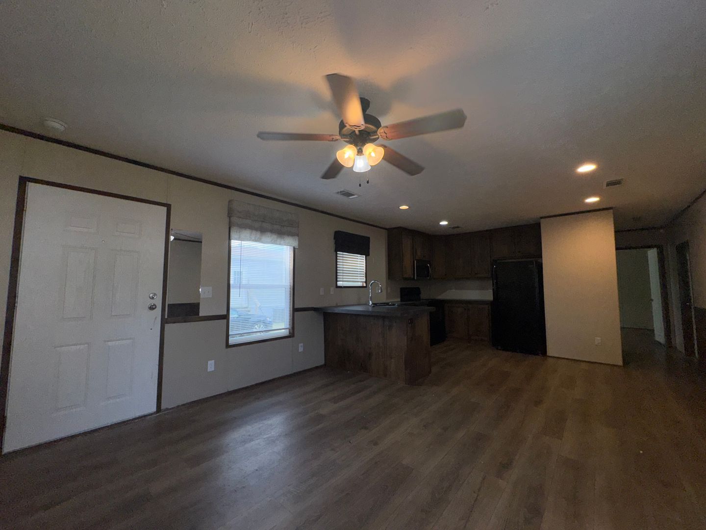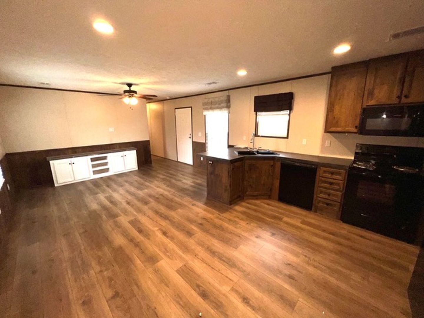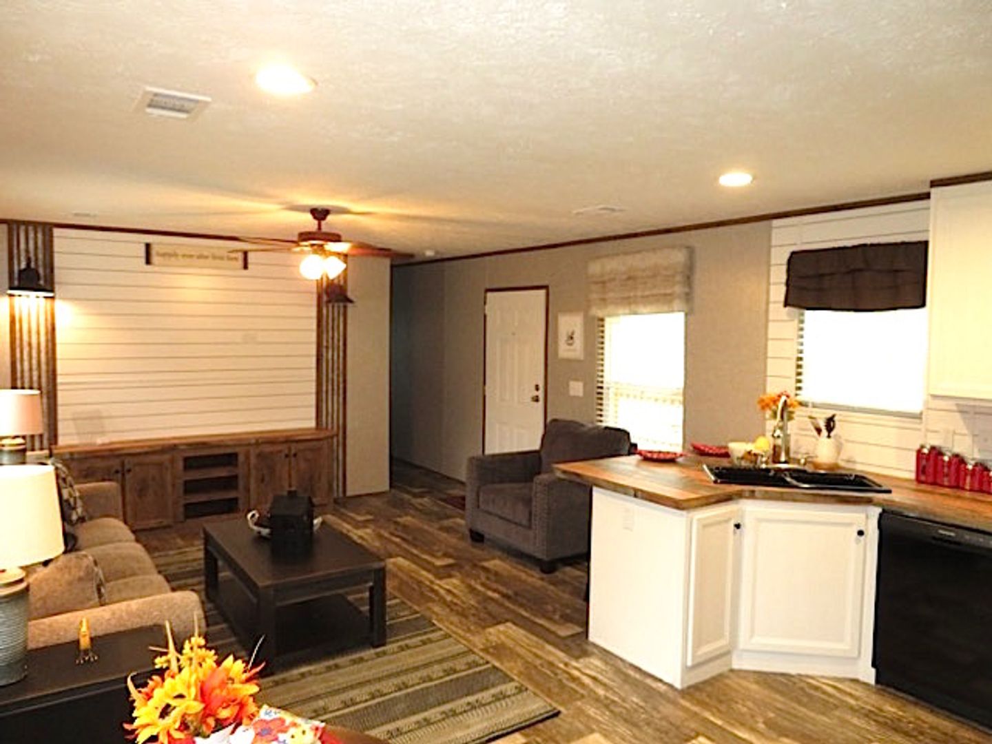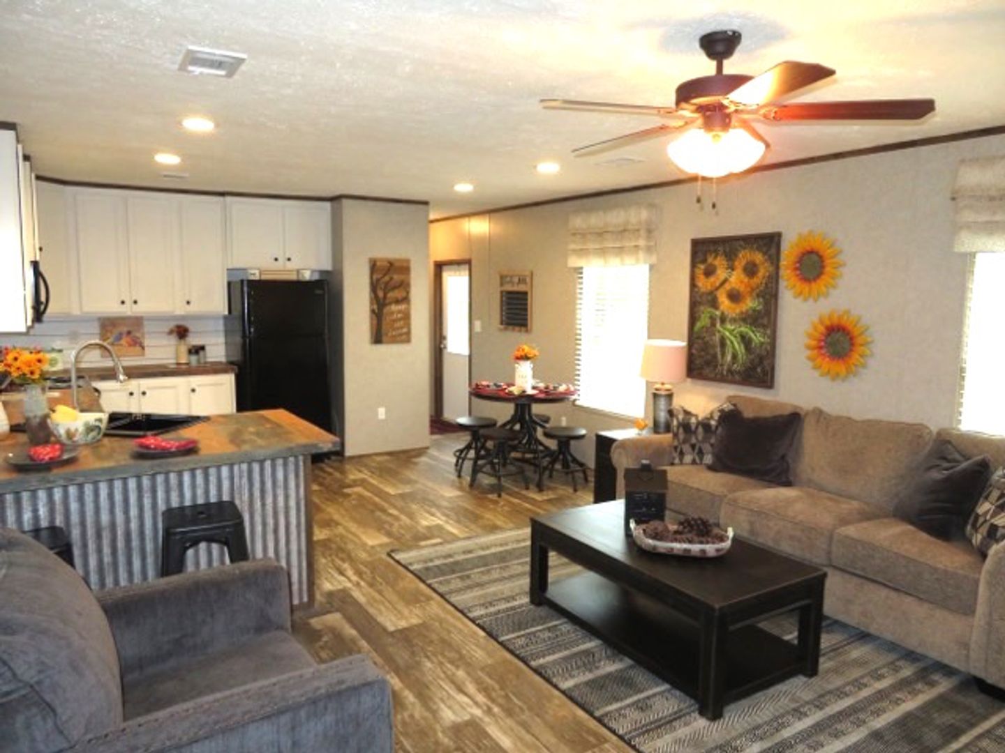 This like-new 2020 Clayton Hunter home has over 1200 square feet and has 3 bedrooms, 3 full baths, and 3 walk-in closets. Yes, each BR has a private bath and its own walk-in closet. All 3 bedrooms are the same size. The home also has roomy 8 ft ceilings with recessed LED lighting and ceiling fans in the LR and all bedrooms. The entire home is wrapped in sturdy OSB siding under the vinyl siding. It also has extra insulation in the walls and ceiling, and low-E double-pane windows for LOW power bills. The heating and air vents are located in the ceiling, so your furniture or rug won't cover your vents. The home is totally electric and has central heat and air, and a digital thermostat you can control from your smartphone from wherever you are. Other features: upgraded 50-gallon water heater so you don’t run out of hot water, steel front door and cottage-type steel rear door, separate laundry room with a pantry wired for a stand-up freezer, open concept kitchen/living area with new black Frigidaire stove with glass tile backsplash, black fridge with ice maker and dishwasher. The kitchen sink has a goose-neck sprayer. Fully lined cabinetry throughout and transom windows, which add extra light. Each bathroom features a sit-down 60" one-piece fiberglass shower with glass doors, china sinks, and towel and tissue holders built in. Built-in entertainment center for your big screen TV, linoleum flooring throughout for durability and easy clean-ups. Large covered deck for entertaining with full-width steps for easy entry and exit.