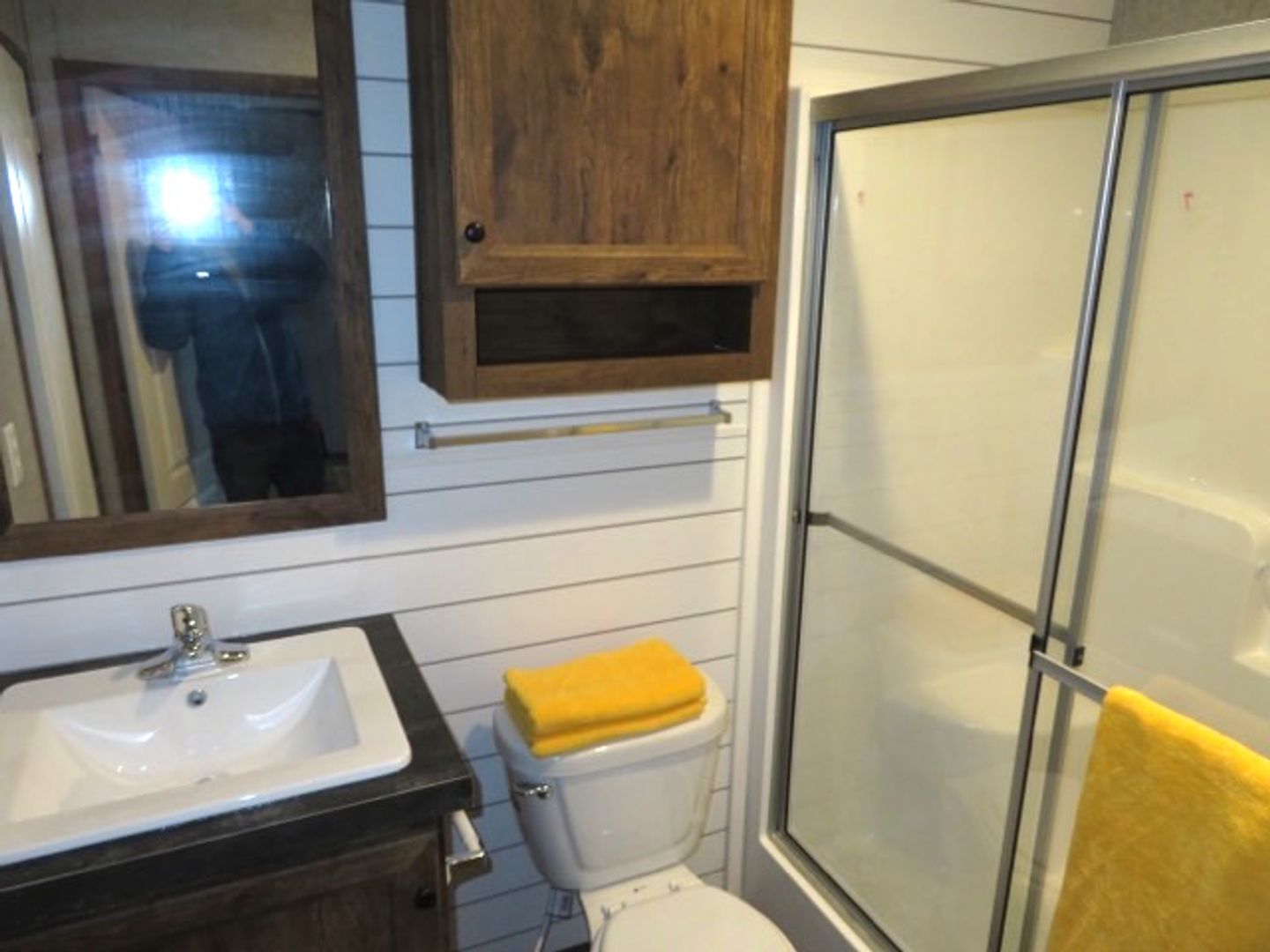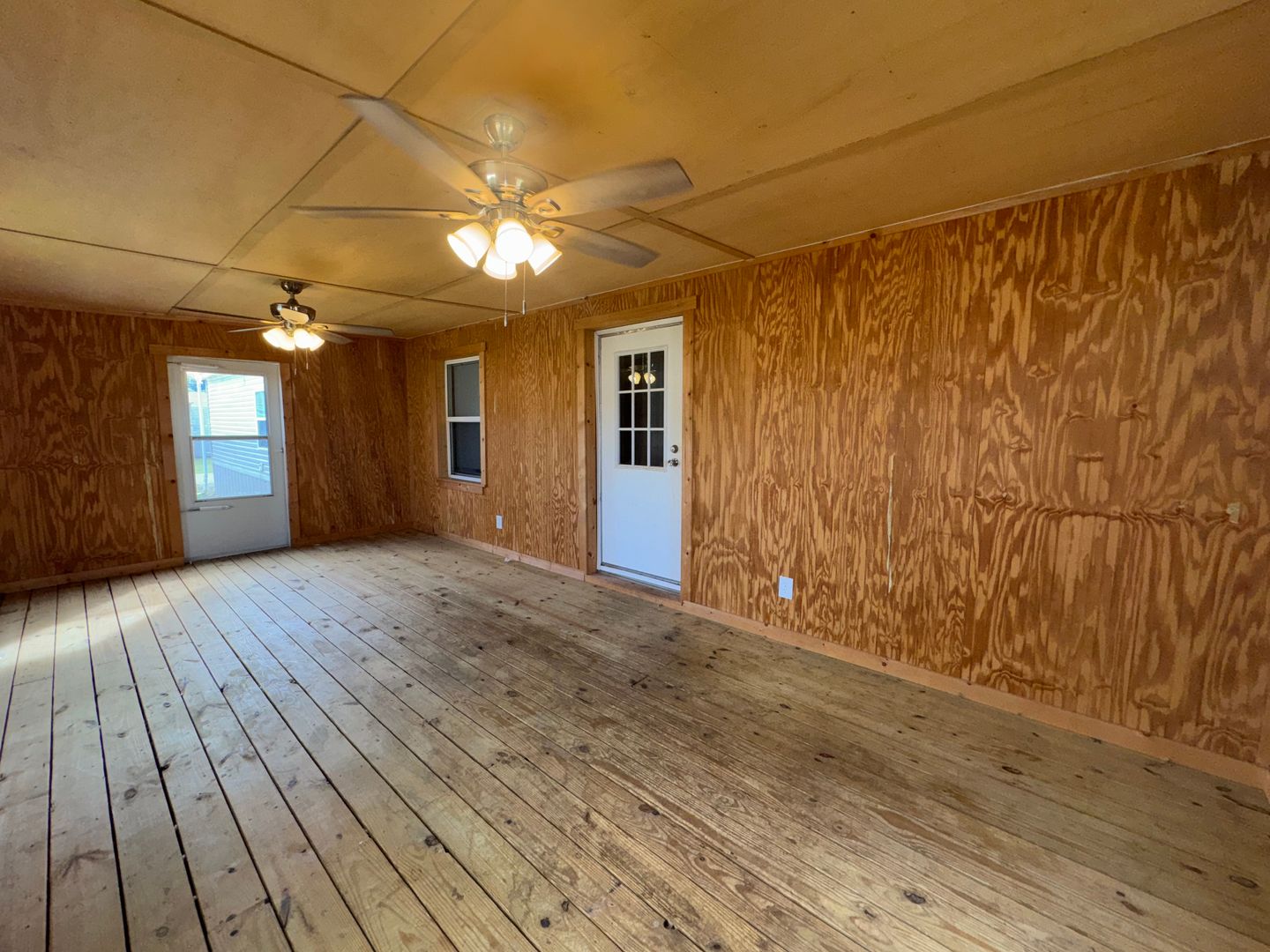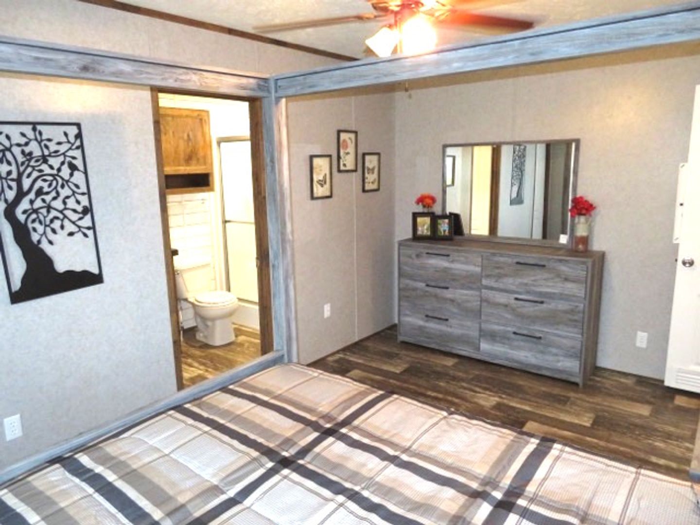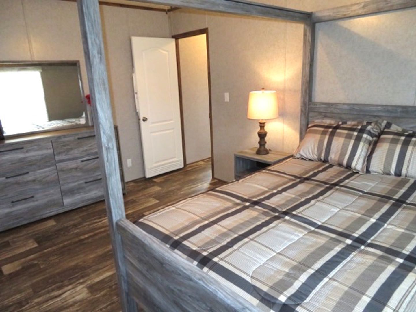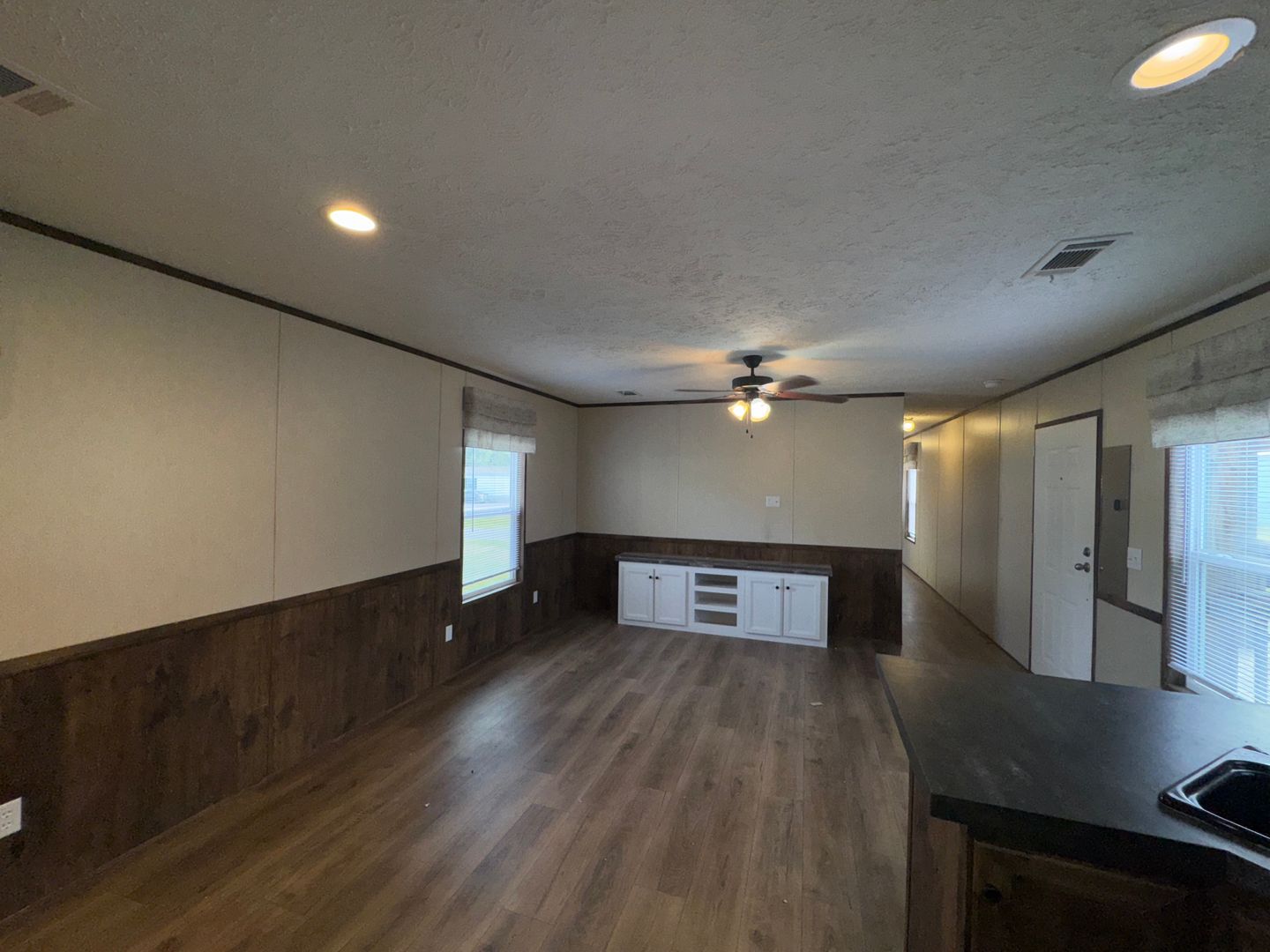 This like-new 2020 Clayton Hunter home has over 1200 square feet and has 3 bedrooms, 3 full baths, and 3 walk-in closets. Yes, each BR has a private bath and its own walk-in closet. All 3 bedrooms are the same size. The home also has roomy 8 ft ceilings with recessed LED lighting and ceiling fans in the LR and all bedrooms. The entire home is wrapped in sturdy OSB siding under the vinyl siding. It also has extra insulation in the walls and ceiling, and low-E double-pane windows for LOW power bills. The heating and air vents are located in the ceiling, so your furniture or rug won't cover your vents. The home is totally electric and has central heat and air, and a digital thermostat you can control from your smartphone from wherever you are. Other features: upgraded 50-gallon water heater so you don’t run out of hot water, steel front door and cottage-type steel rear door, separate laundry room with a pantry wired for a stand-up freezer, open concept kitchen/living area with new black Frigidaire stove with glass tile backsplash, black fridge with ice maker and dishwasher. The kitchen sink has a goose-neck sprayer. Fully lined cabinetry throughout and transom windows, which add extra light. Each bathroom features a sit-down 60" one-piece fiberglass shower with glass doors, china sinks, and towel and tissue holders built in. Built-in entertainment center for your big screen TV, linoleum flooring throughout for durability and easy clean-ups. Large covered deck for entertaining with full-width steps for easy entry and exit.